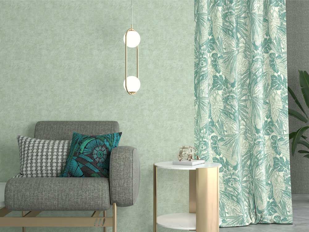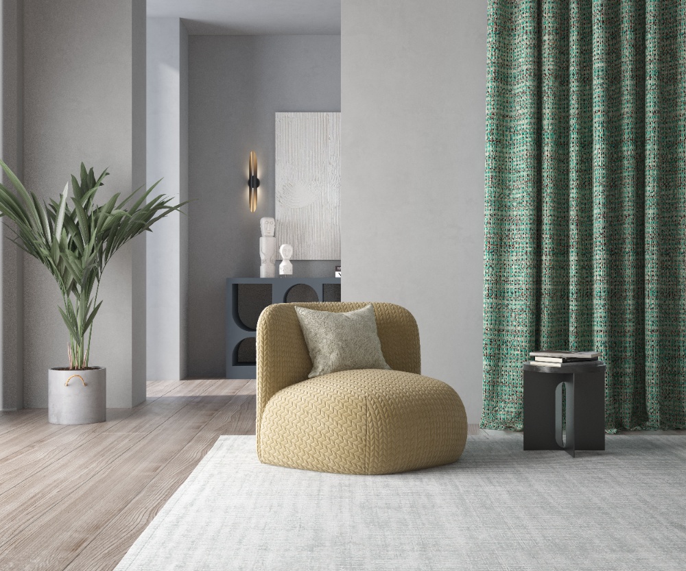 綠色肌理的窗簾呼應小面積黑色邊幾,